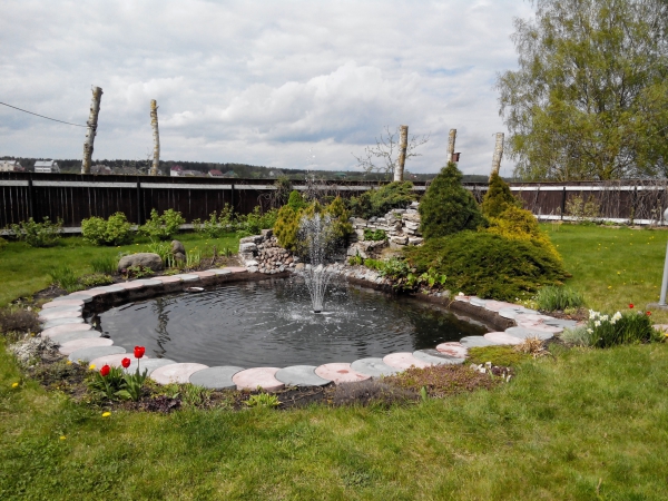 Пруд был сделан специалистами ООО "Акваиндустрия" в 2013 году. Глубина пруда 1,5 м. Были использованы: пленка ПВХ, кокосовый мат, фонтанный насос, насадка, фильтровальная установка немецкого производства. Работы производились в сотрудничестве с ландшафтным дизайнером.